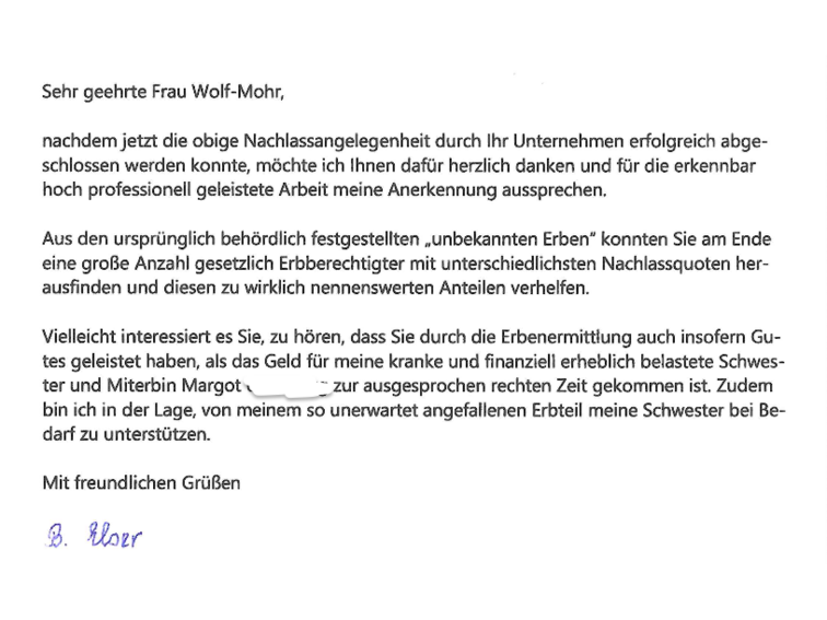 - Inheritance matter Gertraude F.Dear Ms Wolf-Mohr, Now that your company has successfully concluded the above probate matter, I would like to thank you very much and express my appreciation for the clearly highly professional work you have done. From the original ‘unknown heirs’ officially determined by the authorities, you were able to identify a large number of legally entitled heirs with a wide range of inheritance shares and help them obtain a truly significant share. Perhaps you would be interested to hear that, thanks to the heir search, you have also done a good deed in that the money came at just the right time for my sister Margot U., who is ill and under considerable financial strain. Furthermore, I am able to support my sister with my unexpectedly acquired inheritance if needed. Kind regards,Gertraude F